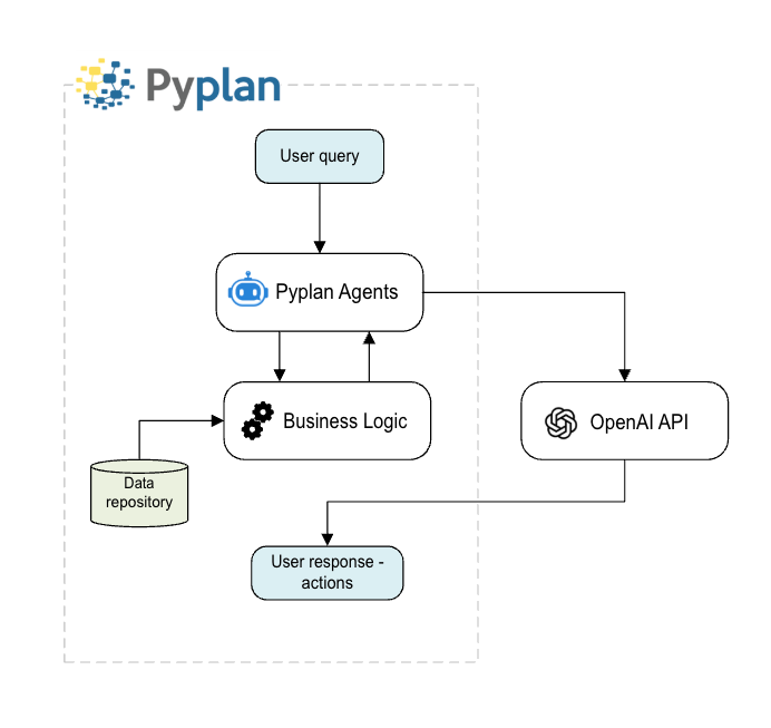 El siguiente diagrama ilustra cómo los Agentes Pyplan interactúan con la API de OpenAI y la lógica de negocio interna, mientras mantienen los datos gestionados de forma segura dentro del entorno de Pyplan: